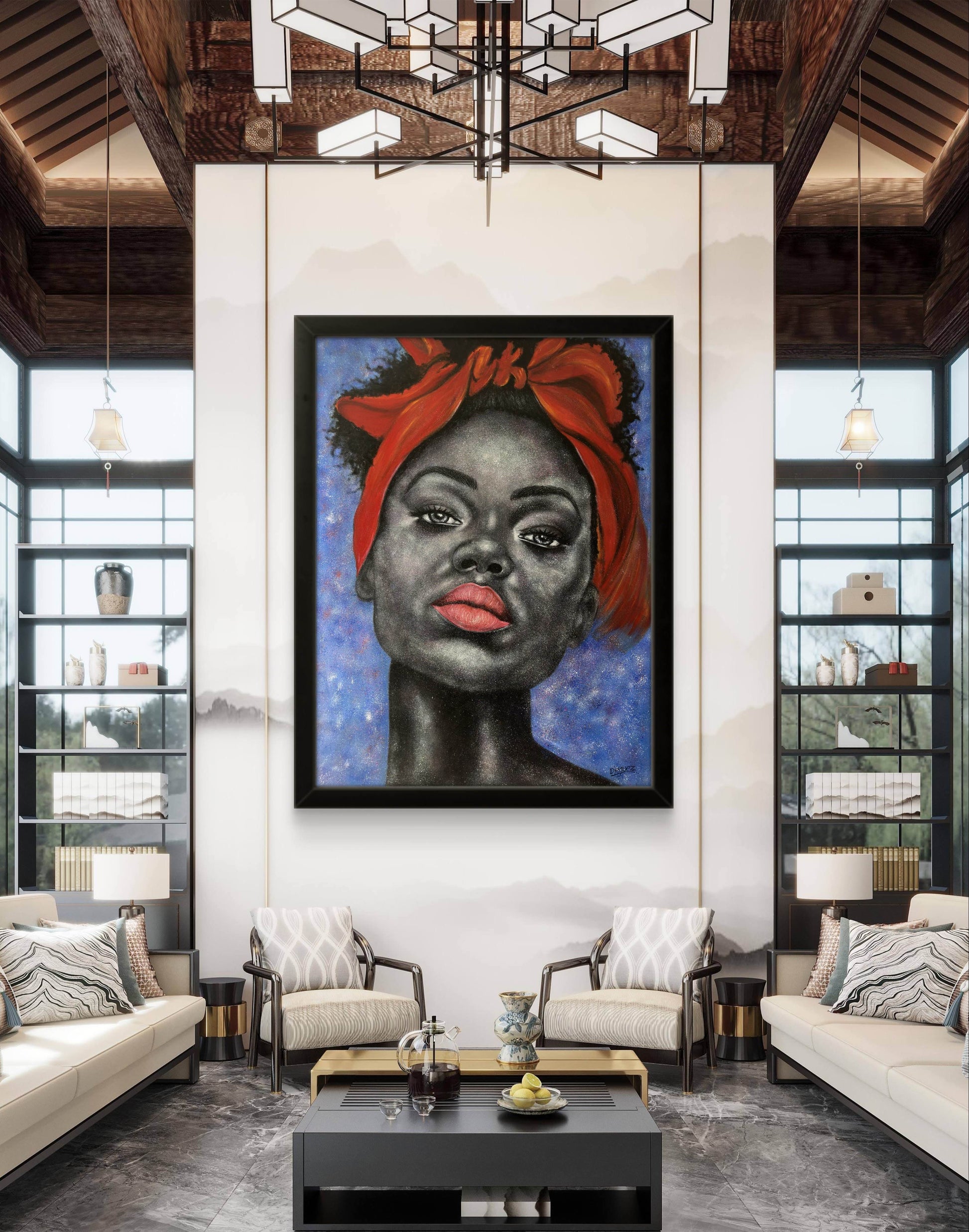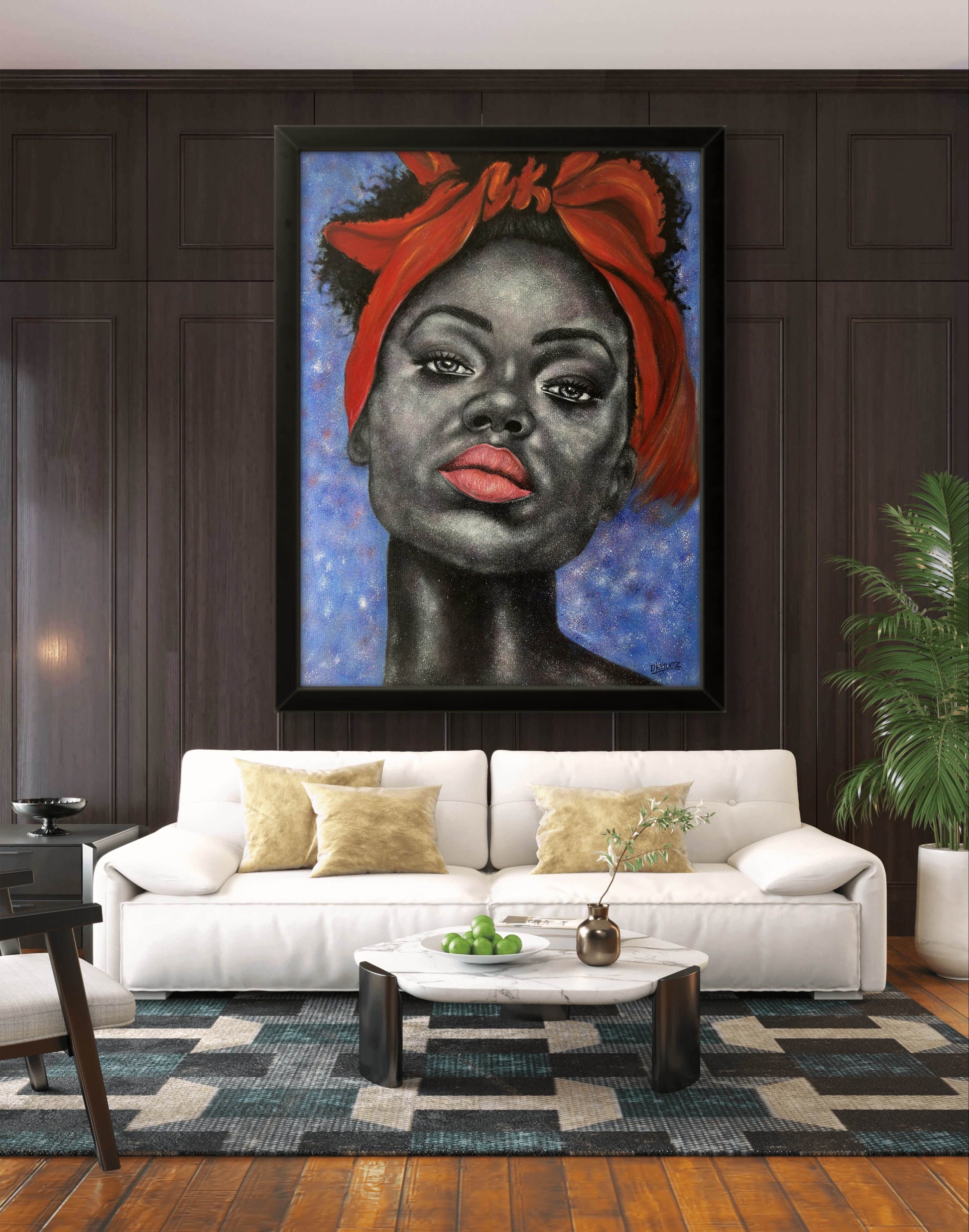 "Rostros Afro Diecisiete": La fuerza de la identidad se eleva en este retrato donde cada trazo celebra la belleza, la dignidad y el orgullo de las raíces. El rojo vibrante del pañuelo y los labios resalta contra la intensidad de la piel, creando un contraste que habla de resistencia, pasión y vida.